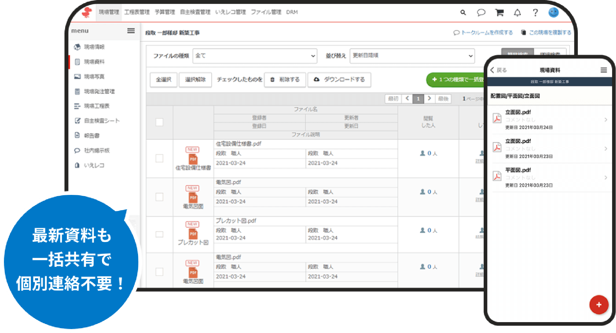 施工現場に必要な情報や、図面などの資料すべてをクラウド上に一元化。