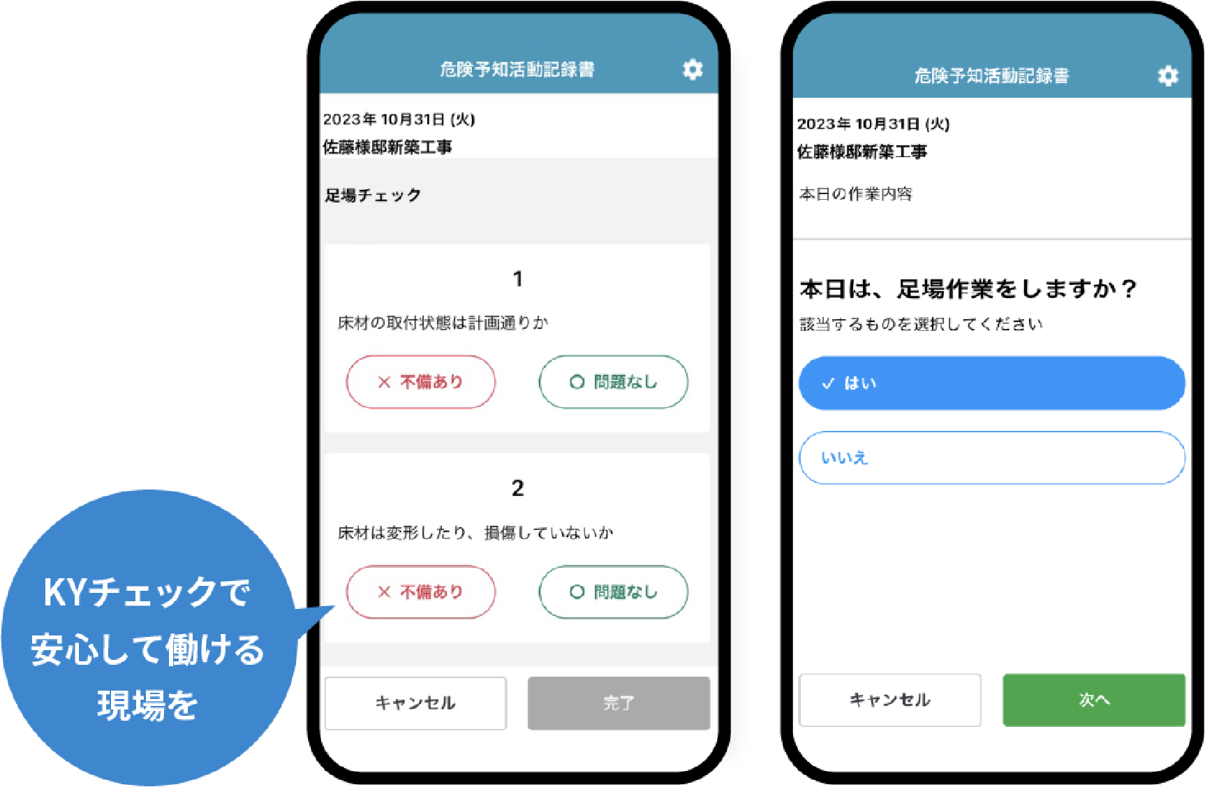 「入退場機能」と合わせてご利用いただく"危険予知活動(KY活動)”をチェックする機能です。入場時にその日の作業に合わせたKY活動を実施。入場時の打刻と合わせてヒューマンエラーやリスクを事前回避し労働災害を防止します。日々職方が入れ替わる建築現場でも、一定の水準で安全管理の記録が可能です。