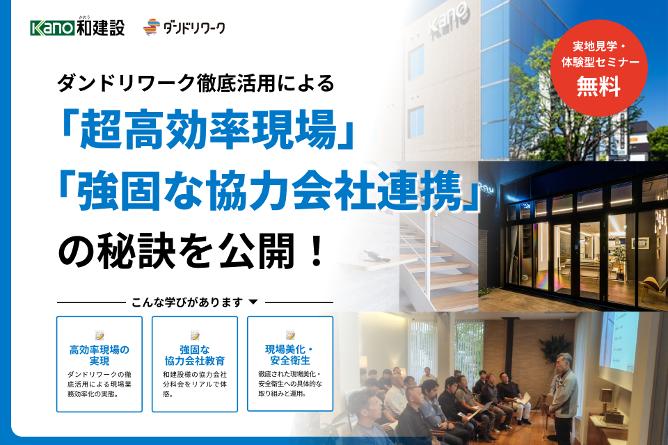 | 内容 | ■セミナー概要 ダンドリワークを徹底活用することで「超高効率現場」と「強固な協力会社連携」を実現されている和建設様の「仕組み」を、現場視察や協力会社分科会への参加を通じてリアルに体感できます。協力会社教育のノウハウや、徹底された現場美化・安全衛生の具体的な取り組み、そしてダンドリワークのオプション機能活用事例を学べる1日です。 ■予定プログラム ■このセミナーで学べること(ご参加企業様への期待効果) |