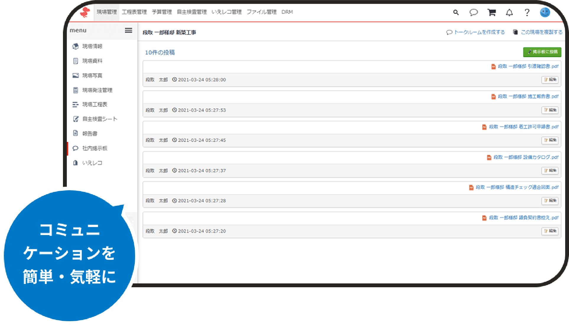 各現場ごとに、社内関係者だけで共有したい情報をまとめて掲載できます。社内スタッフのみの書き込みや閲覧が可能、契約書や保証書のコピーなどPDFの添付もできるので出先やアフター訪問でもすぐに見直せます。