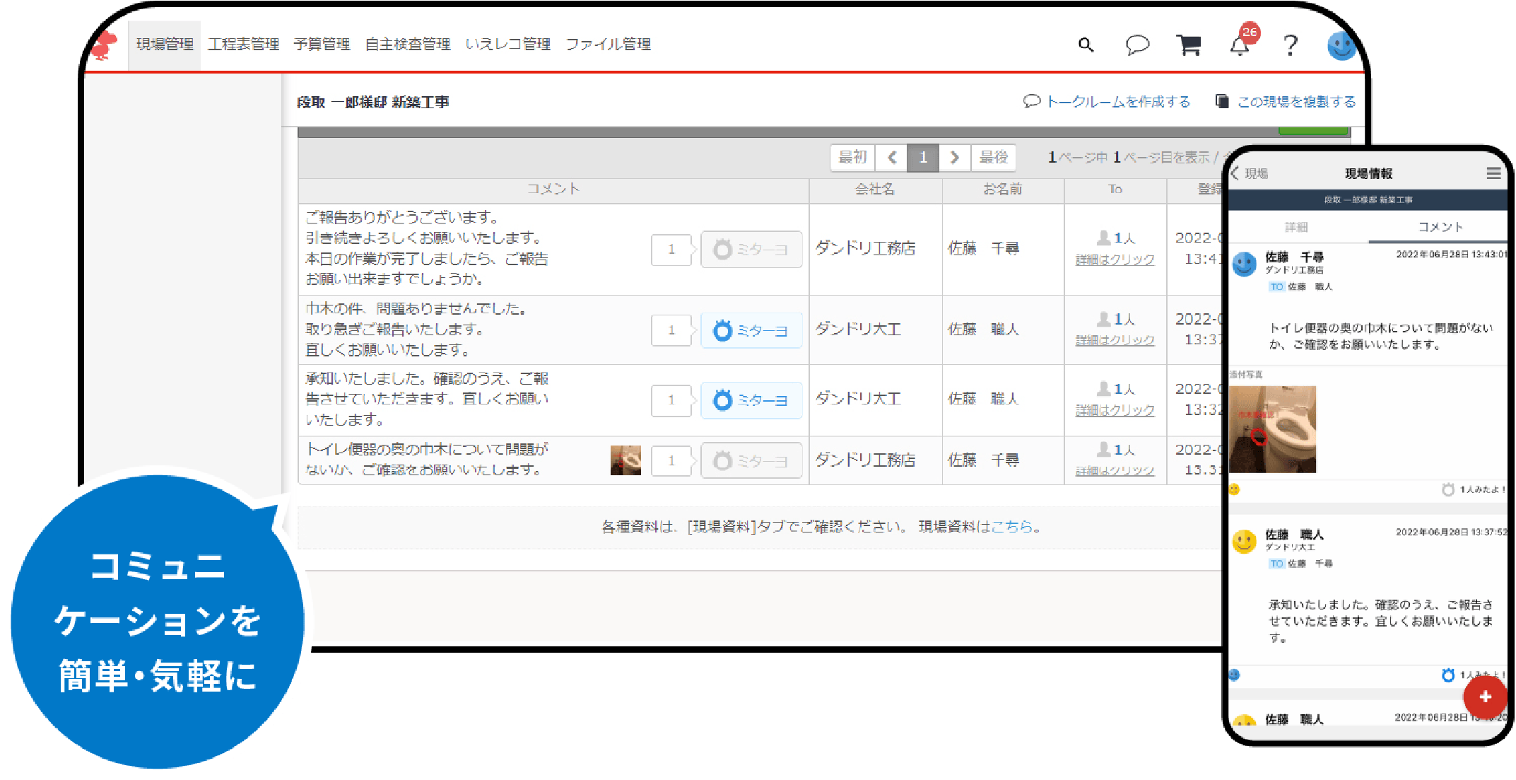 現場ごとにコメント・情報の伝達が可能です。関係者にリアルタイムに漏れなく伝わり、いつでも内容を確認できるので「言った言わない」を防げます。また、リアクション機能「ミターヨ」の利用で個人単位で閲覧したかどうかの確認も可能です。